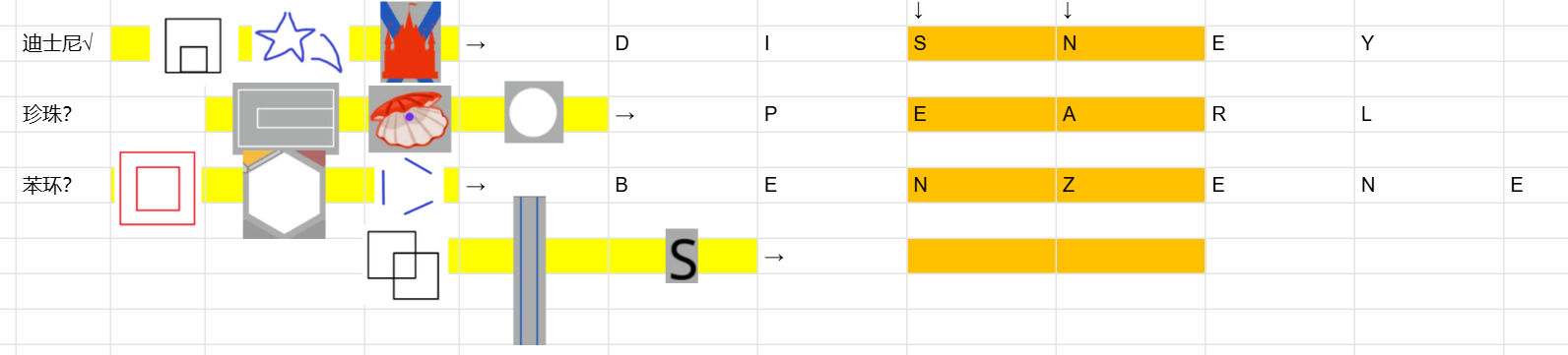 塞德莎:去年四方谜Final-Meta的CallBack,开赛前刚手动做过一遍,所以一上来主动认领了,但做着做着发现不对劲,队友题目都秒完了我才刚提取完全部图像要素,然后盯了半天就看出前三个,如下图。